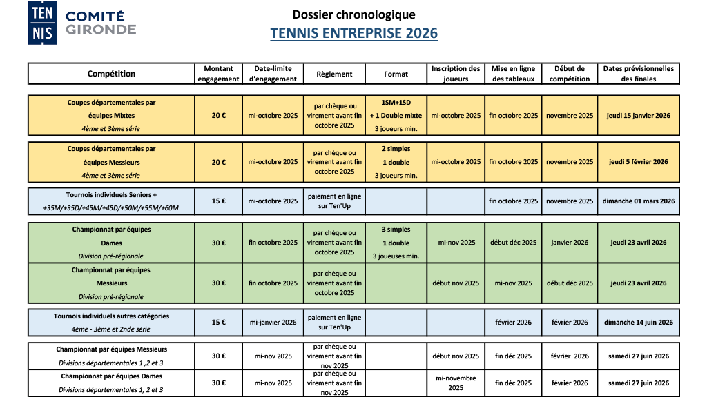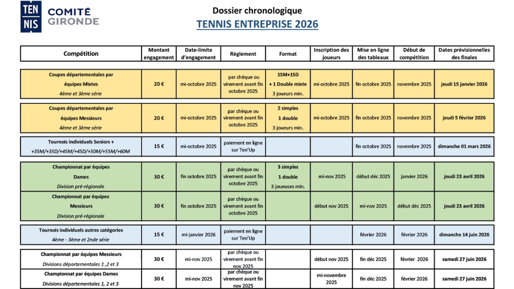 Dossier chronologique - calendrier prévisionnel Tennis Entreprise 2026