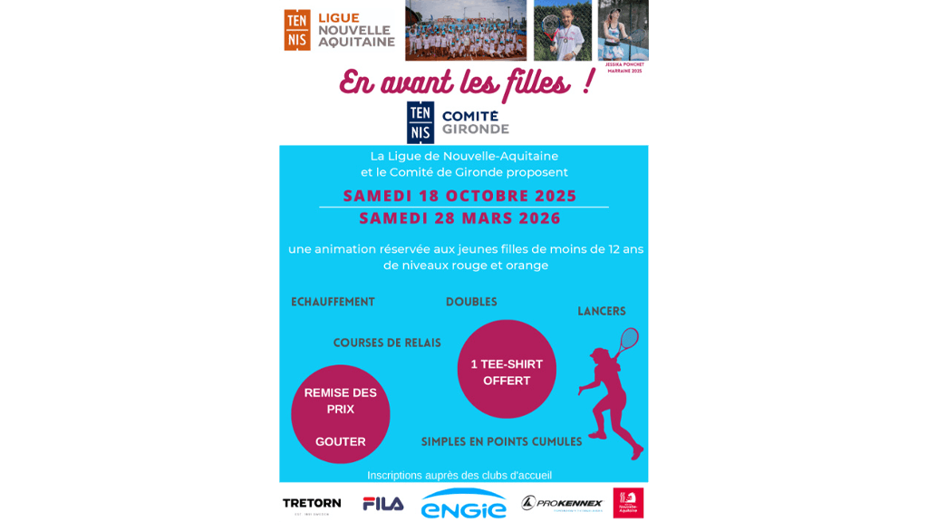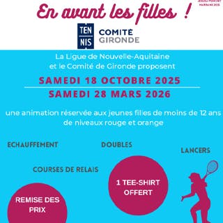 L'action "EN AVANT LES FILLES" concerne les jeunes filles de 7 à 12 ans (niveaux ROUGE ou ORANGE) qui débutent l'apprentissage du tennis par une approche adaptée du match dans plusieurs clubs répartis géographiquement au sein des départements de la Ligue de Nouvelle Aquitaine.